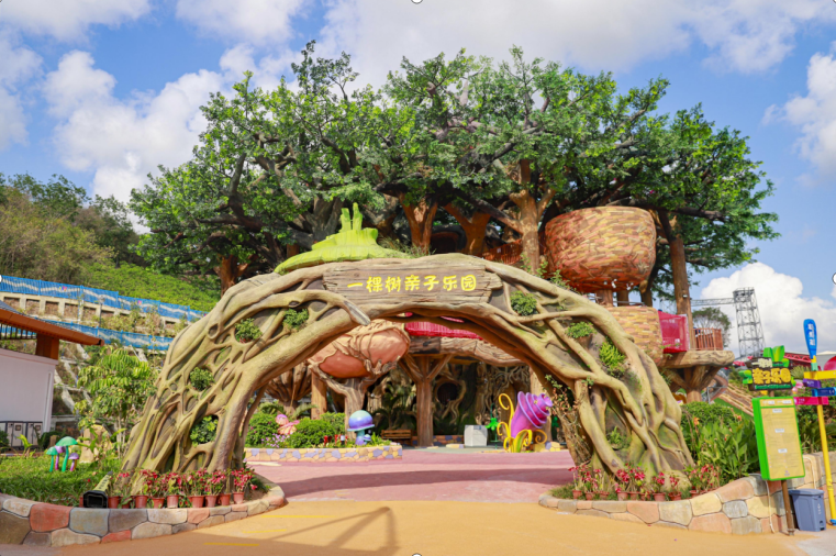 整个乐园是以智慧古树为主题形象,并搭配有各式各样的花卉、果实、蘑菇的卡通化实景,再配合活泼轻松的音乐,为小朋友们在现实世界搭建心中的童话乐园