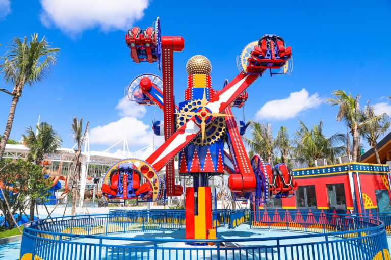 冲出椰林寨是一个结合经典 IP 和惊险过山车的主题游乐项目,配合着高速的飞车,急转、翻腾、旋转、飞驰,时而冲上云霄、时而俯冲深谷、时而进入椰林,超越感官,为游客带来精神和感官的双重享受。